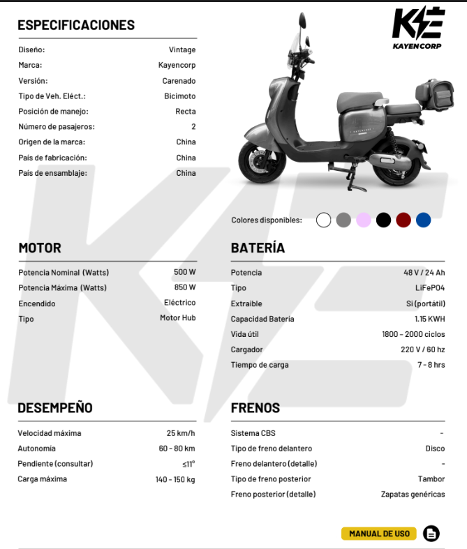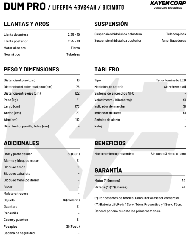 *Batería: LITIO EXTRAÌBLE LIFEPO4 de 48V/ 24 AH ( Tiempo de vida de esta batería es de más de 5 años y cuenta con 2 años de GARANTIA en BATERIA)
